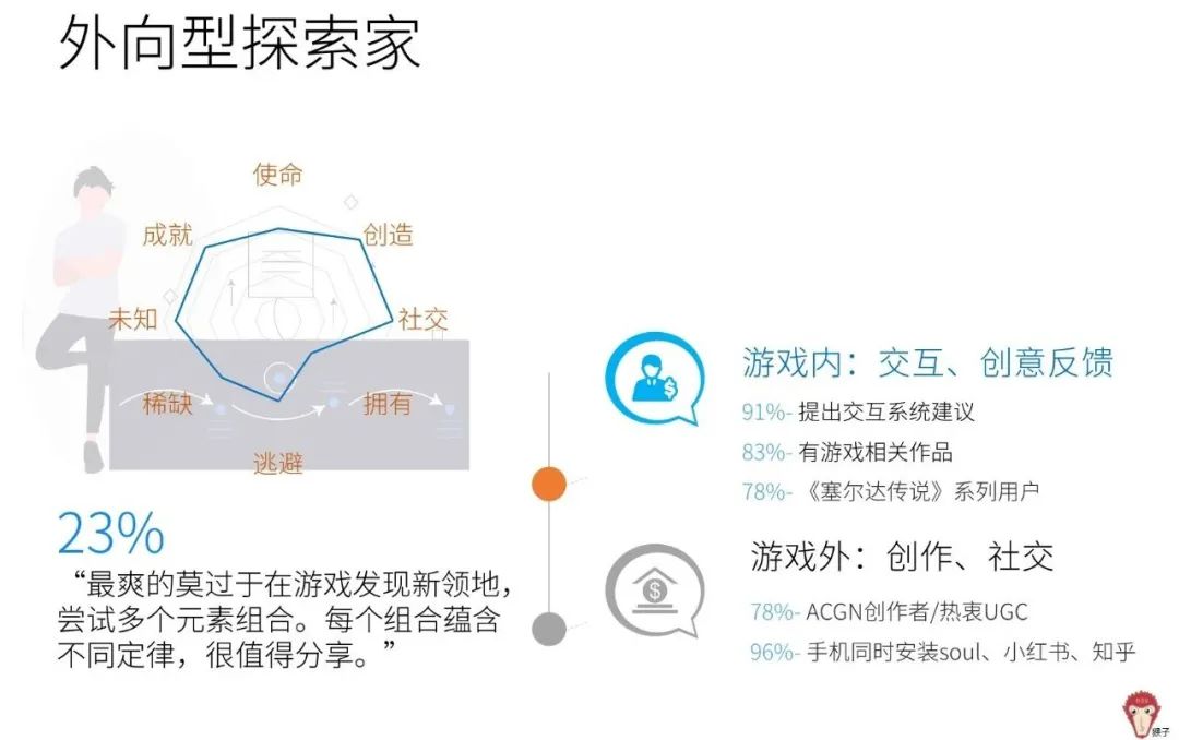 我们通过KJ法已经将近100名核心用户分为了四个类别,成就型人格者、外向型探索家、剧中人和客观型行业人员,占比为46%,23%,21%,10%(分三个层级)。