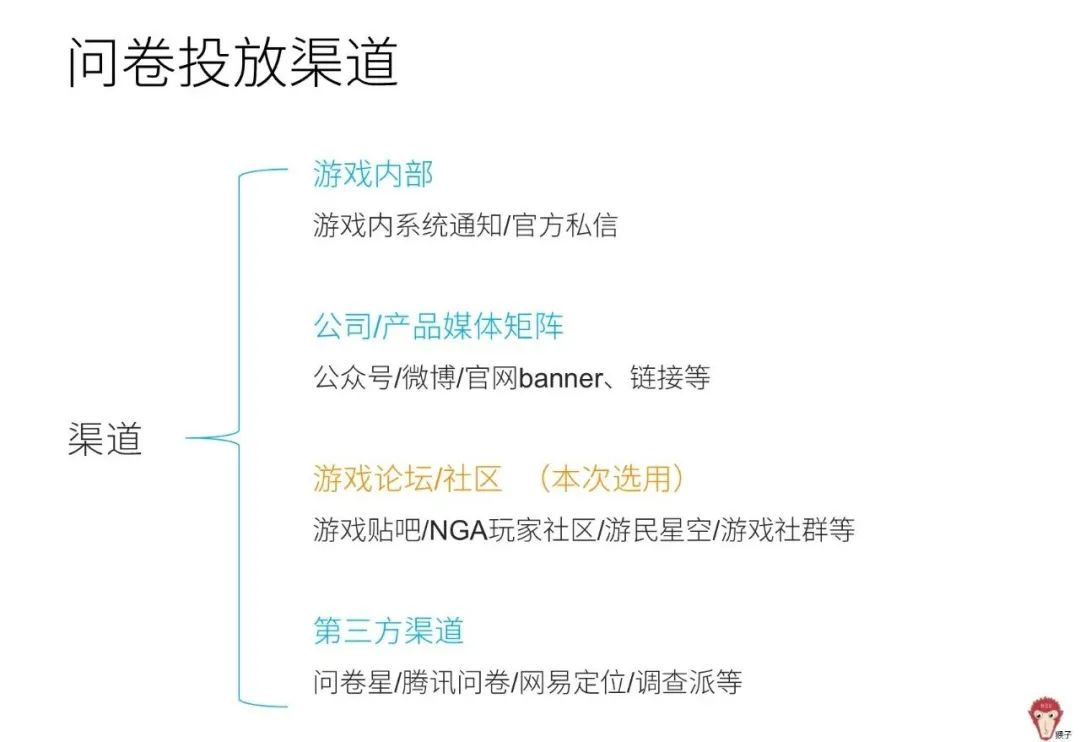 问卷投放渠道包括以下四类。由于我们需要采集外部的游戏核心用户,因此选择垂直类渠道——游戏论坛/社区投放问卷。