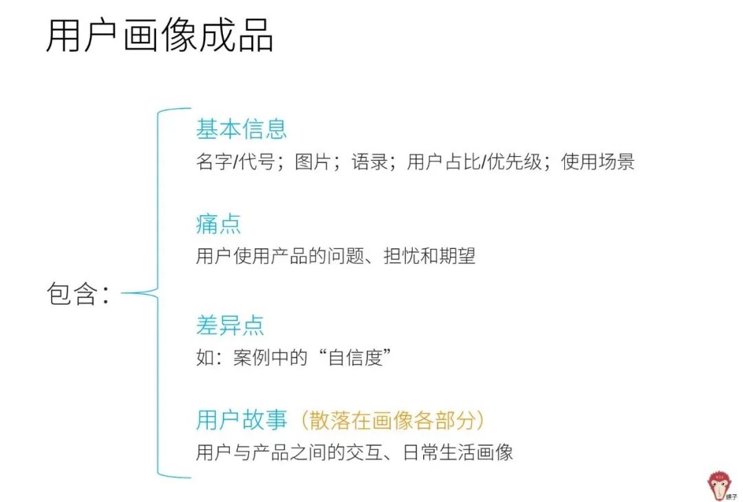最后提炼用户基本关键、痛点、关键差异及用户故事,组成用户画像。