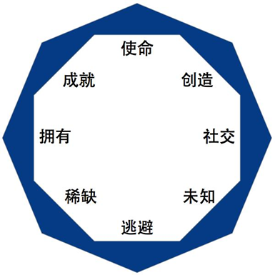 八角行为分析法出自Yu-Kai Chou《游戏化实战》一书,涵盖由个体情感出发的游戏八大动机:使命,成就,创造,拥有,社交,稀缺,未知和逃避。