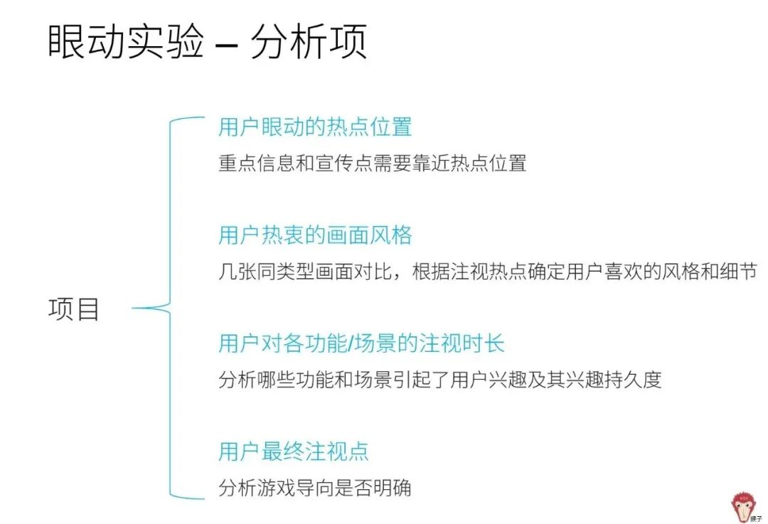 眼动实验监测用户进行游戏时的眼睛运动和注视方向,可以确定用户眼动的热点位置、对特定风格画面的偏好、以及对各环节的注视时长等。