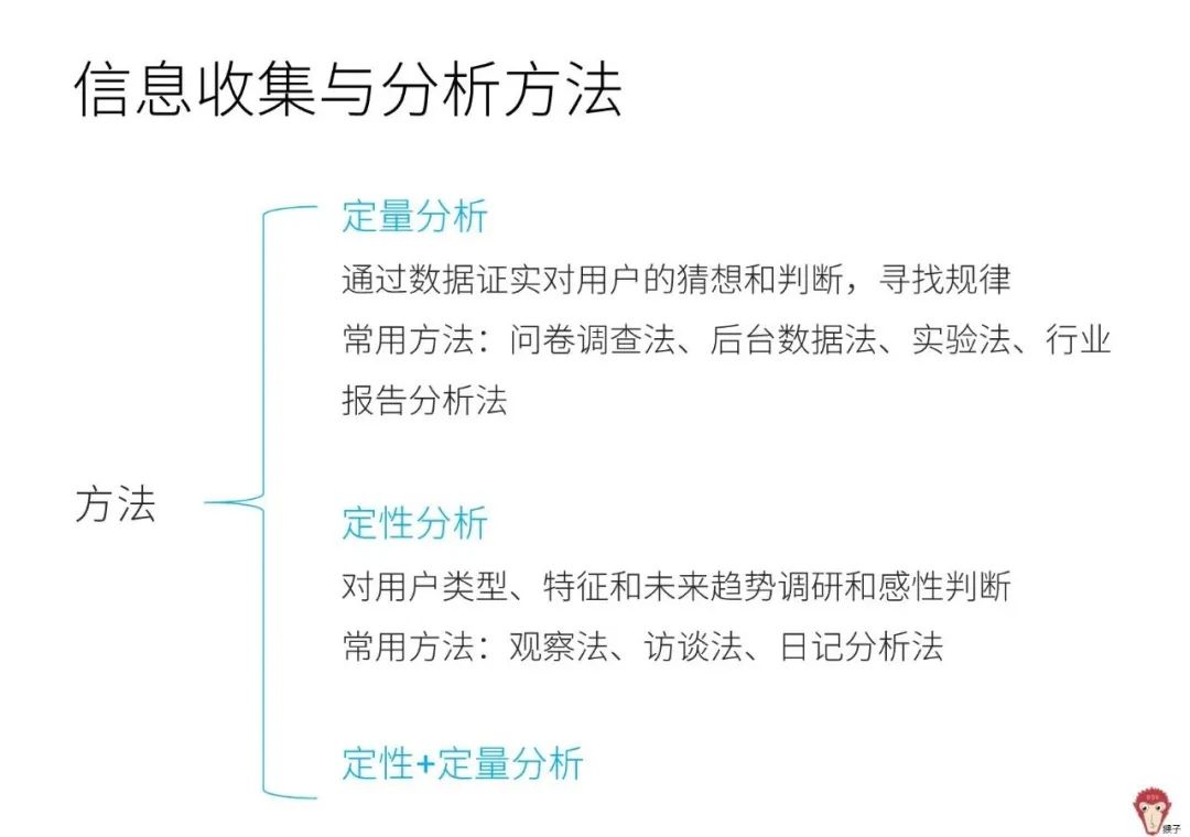 信息收集和分析的方法包括定量和定性两大类,实际工作中,定量和定性研究通常结合使用。
