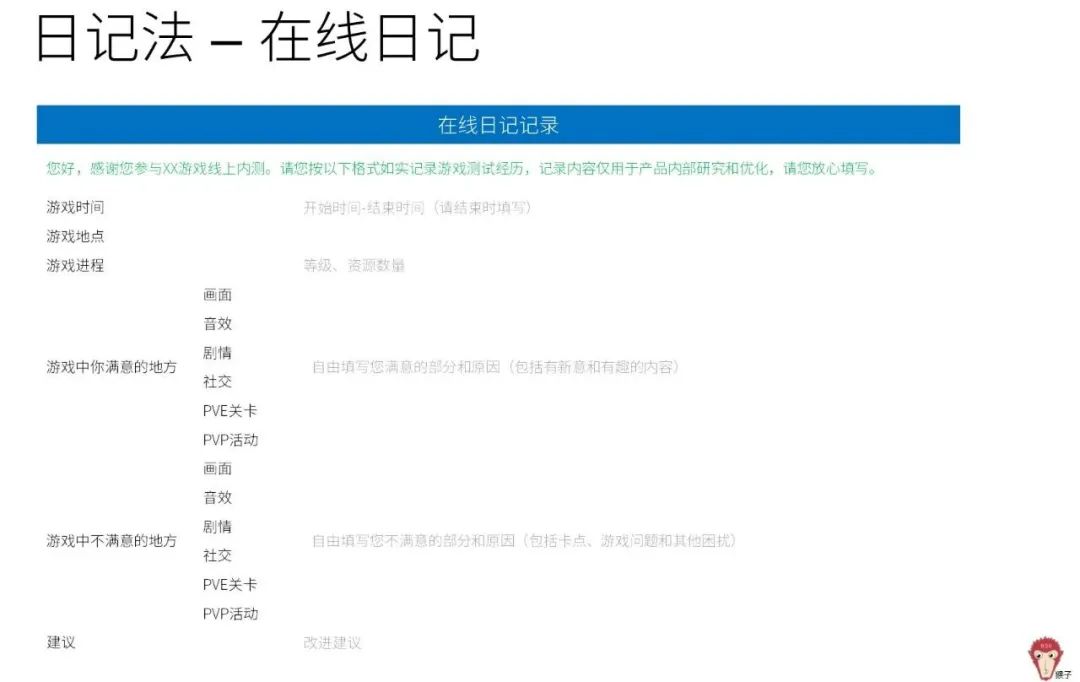 在线日记对应现场内测的观察、量表和部分深度访谈内容。有条件的话,让用户连续几天记录在线日记,观察游戏体验变化、卡点/疑惑是否随时间解除、综合评价等。