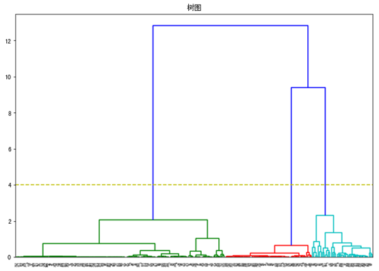 树图中,X轴代表样本,y轴代表样本间的距离,蓝色线条代表样本间的距离最远。因此设定阈值为4,切割树状图: