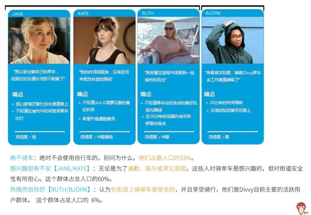 先学习一下合格的用户画像是怎样的?案例来自Fantham针对Divvy Bike共享单车的用研设计方案。