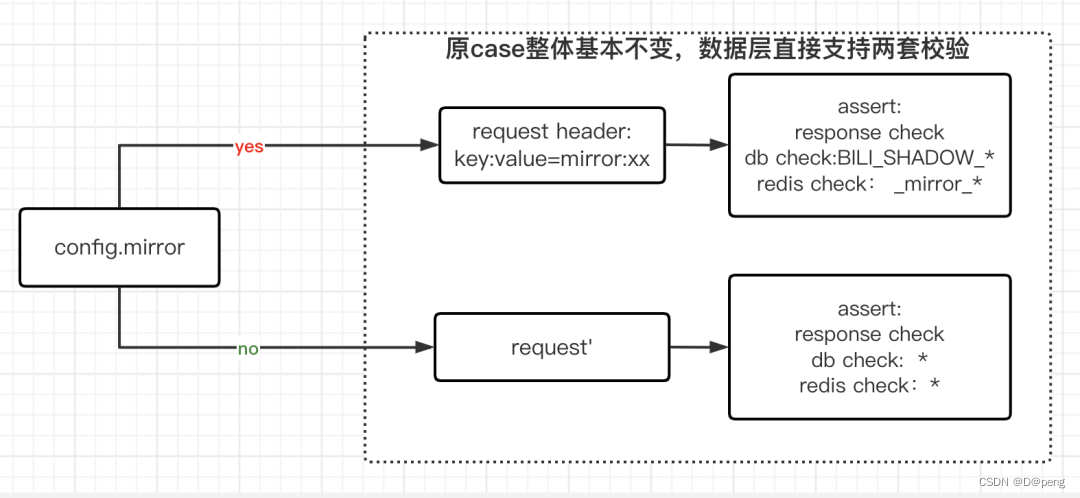 基于服务改造范围大、涉及的接口多、链路长的特性,怎么提升测试效率以及回归效率(底层bugfix回归)是需要解决的一大难题,本次方案主要采用case复用的思路来解决效率问题,复用已有业务沉淀的自动化case,在此基础上,保持case中间部分业务结构不变,通过mirror识别,仅修改头部流量入口和尾部规则校验方法,让case能复用于压测流量,快速将case翻倍。