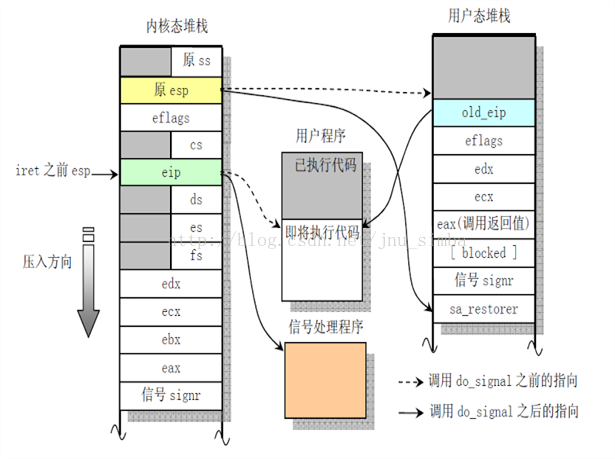 在找到了信号处理函数之后,do_signal() 函数首先把内核堆栈中存放返回执行点的eip保存为old_eip,然后将eip替换为信号处理函数的地址,然后将内核中保存的“原ESP”(即用户态栈地址)减去一定的值,目的是扩大用户态的栈,然后将内核栈上的内容保存到用户栈上,这个过程就是设置frame.值得注意的是下面两点:
