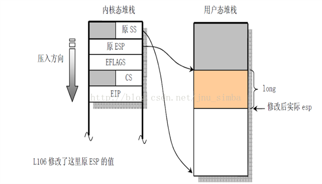 在处理完系统调用以后,就要调用do_signal()函数进行设置frame等工作。这时内核堆栈的状态应该跟下图左半部分类似(系统调用将一些信息压入栈了):