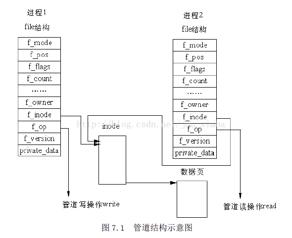 图中有两个 file 数据结构,但它们定义文件操作例程地址是不同的,其中一个是向管道中写入数据的例程地址,而另一个是从管道中读出数据的例程地址。这样,用户程序的系统调用仍然是通常的文件操作,而内核却利用这种抽象机制实现了管道这一特殊操作。