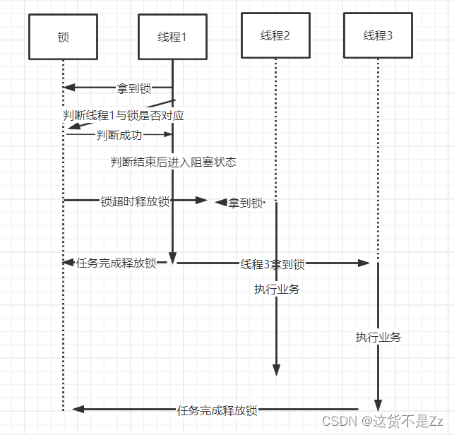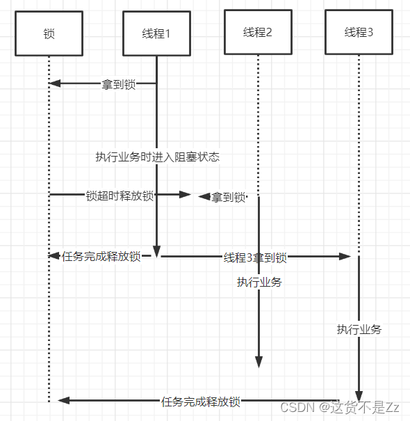 当线程1拿到锁后在执行业务时因为某些原因进入阻塞状态导致锁超时自动释放,这时线程2拿到锁,再线程2的业务没有执行完时,线程1从阻塞状态转换为运行状态,业务执行完成执行释放锁的代码,这是线程2拿到的锁被莫名奇妙的释放了,这就产生了问题。