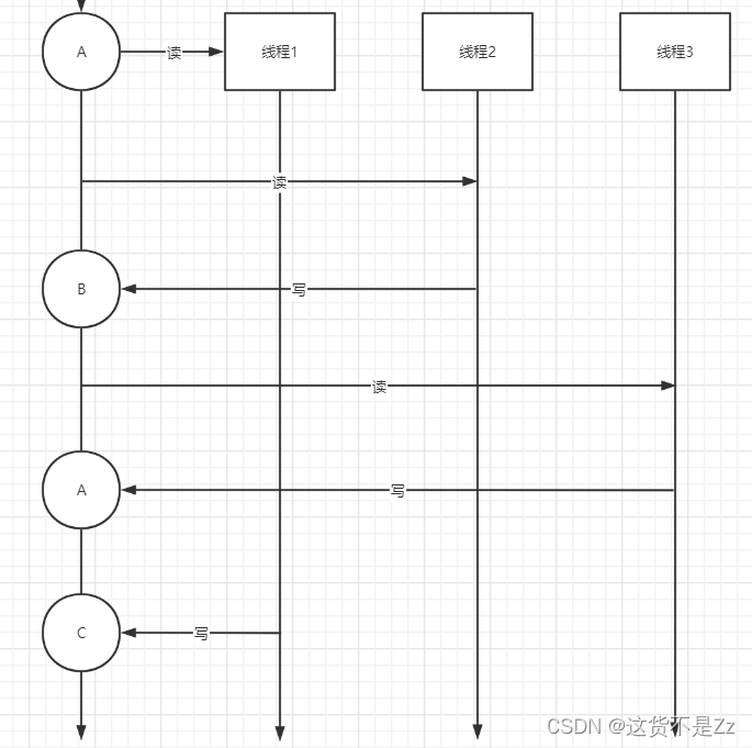 当线程1读入A数据后,线程1进入阻塞状态或者处理业务过长。这时线程2读入数据,将A改成B,随后线程3读入数据,将B改成A,这时线程1开始存入数据,将线程1读到的数据与数据库中的数据进行对比发现相同,这时可以将A改成C 。