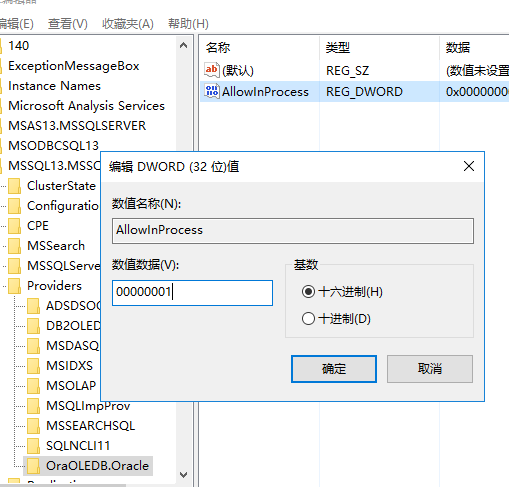 为“OraOLEDB.Oracle”这个键新增一个DWORD 32位,把名字改为“AllowInProcess”