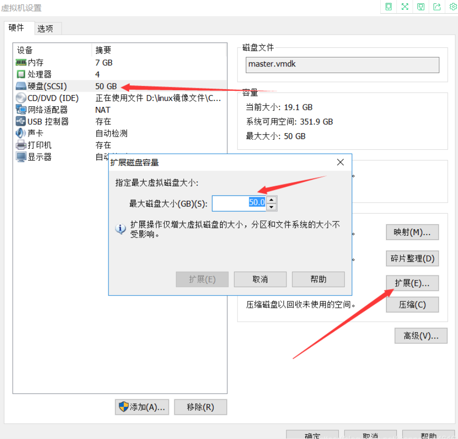 - 关闭Vmware的centos7系统,才能在VMWare菜单中设置需要增加到的磁盘大小,如下图所示: