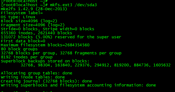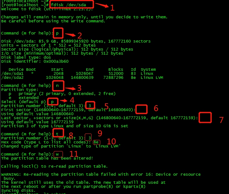 3 分区号输入3(因为1,2已经用过了,sda1是分区1,sda2是分区2,sda3分区3)