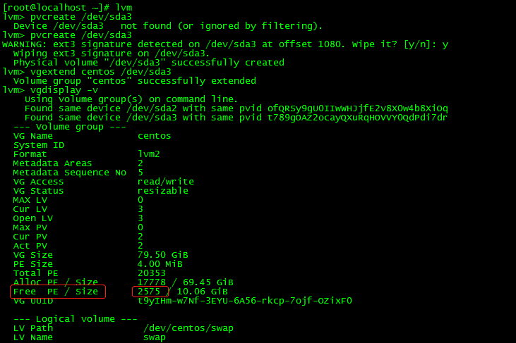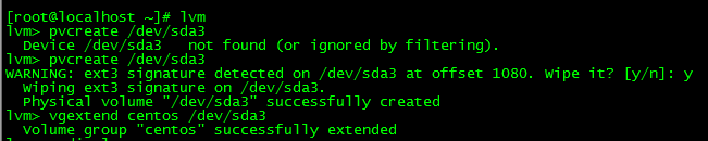 lvm>vgextend centos /dev/sda3 将初始化过的分区加入到虚拟卷组centos (卷和卷组的命令可以通过 vgdisplay )