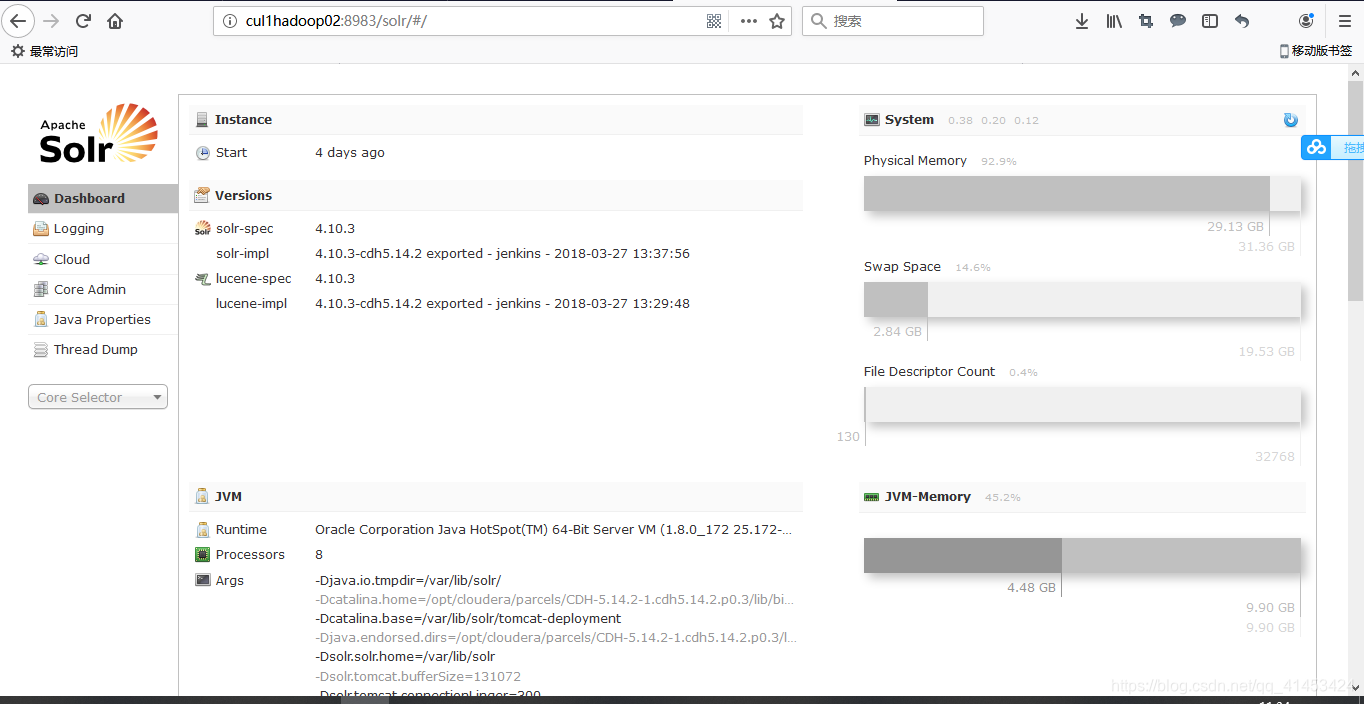 步骤很简单在这里就不在详细介绍了,把下载好的solr部署在tomcat底下,启动tomcat就可以看到可视化管理页面了(应为它是个web项目,有个页面很正常)
