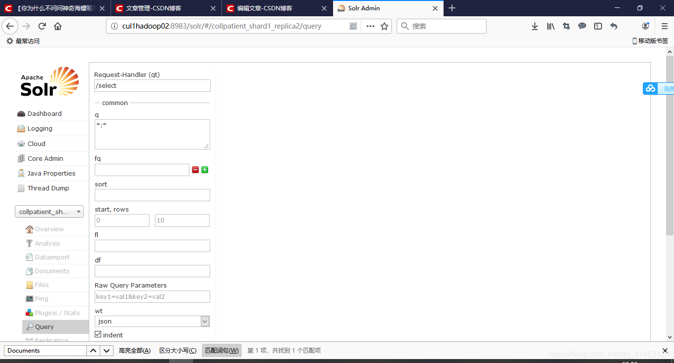 //		doc.addField("bjsxt", "java和大数据培训");doc.addField("bjsxt1", "大数据4");client.add(doc);client.commit();}public void testDelete() throws SolrServerException, IOException{CloudSolrClient client = new CloudSolrClient("192.168.249.131:2181,192.168.249.131:2182,192.168.249.131:2183");client.setDefaultCollection("collection1");client.deleteById("001");client.commit();}public void testQuery() throws SolrServerException, IOException{CloudSolrClient client = new CloudSolrClient("192.168.249.131:2181,192.168.249.131:2182,192.168.249.131:2183");client.setDefaultCollection("collection1");//可视化界面左侧条件SolrQuery params = new SolrQuery();//设置qparams.setQuery("bjsxtall:*");//设置分页//从第几条开始查询,从0开始params.setStart(0);//查询几个params.setRows(10);//启动高亮params.setHighlight(true);//设置高亮列params.addHighlightField("bjsxt");//设置前缀params.setHighlightSimplePre("<span style='color:red;'>");//设置后缀params.setHighlightSimplePost("</span>");//相当于点击查询按钮, 本质,向solr web服务器发送请求,并接收响应. query对象里面包含了返回json数据QueryResponse response = client.query(params);Map<String, Map<String, List<String>>> hh = response.getHighlighting();//取出docs{}SolrDocumentList solrList = response.getResults();for (SolrDocument doc : solrList) {System.out.println(doc.getFieldValue("id"));System.out.println("未高亮:"+doc.getFieldValue("bjsxt"));Map<String, List<String>> map = hh.get(doc.getFieldValue("id"));System.out.println(map);//list可能为nullList<String> list = map.get("bjsxt");System.out.println(list);if(list!=null&&list.size()>0){System.out.println("高亮:"+list.get(0));}else{System.out.println("没有高亮内容");}System.out.println(doc.getFieldValue("bjsxt1"));}}}