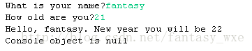 public class InputTest {public static void main(String[] args){Scanner in = new Scanner(System.in);// get first inputSystem.out.print("What is your name?");String name = in.nextLine();// get second inputSystem.out.print("How old are you?");int age = in.nextInt();// display output to consoleSystem.out.println("Hello, " + name + ". New year you will be " + (age + 1));Console cons = System.console();if(cons != null){System.out.print("User Name:");String username = cons.readLine();System.out.print("Password: ");char[] passwd = cons.readPassword();}else{System.out.println("Console object is null");}}