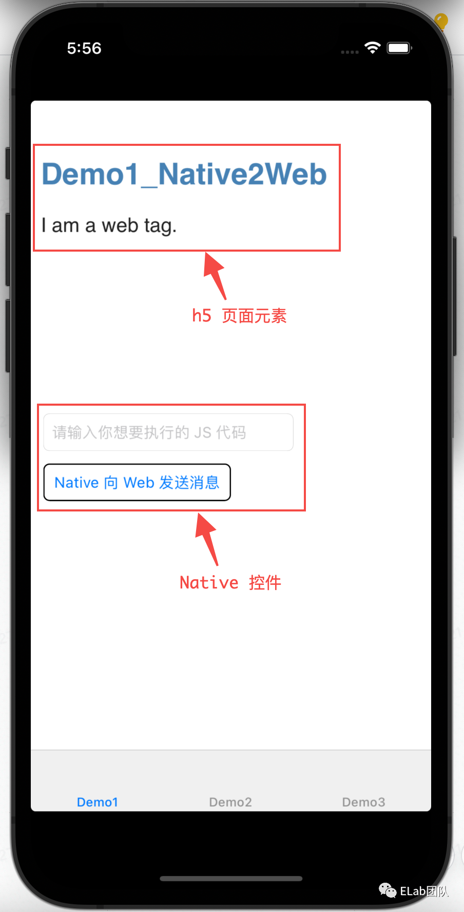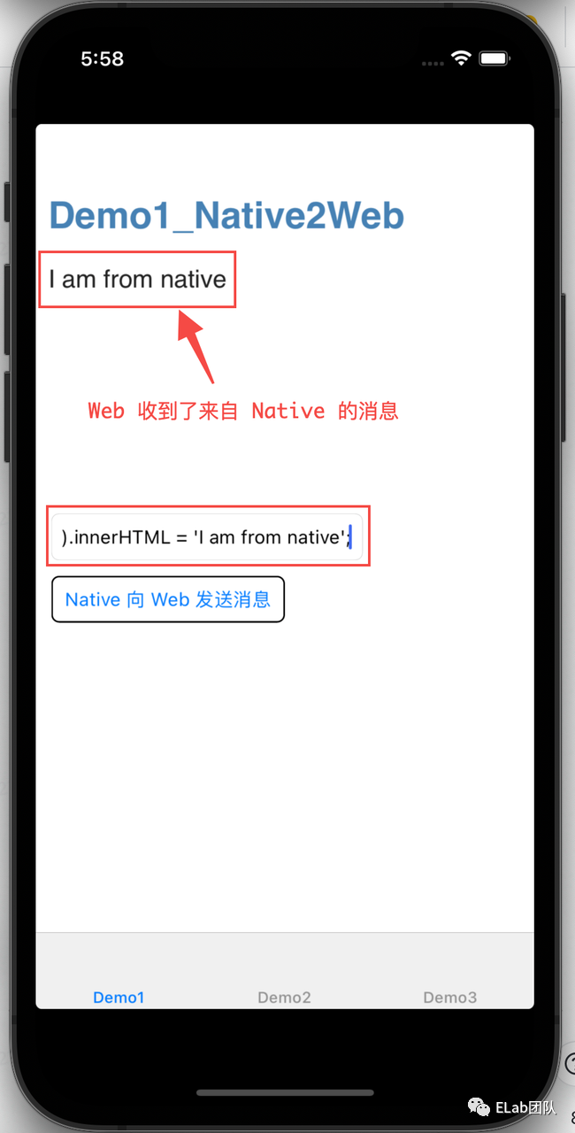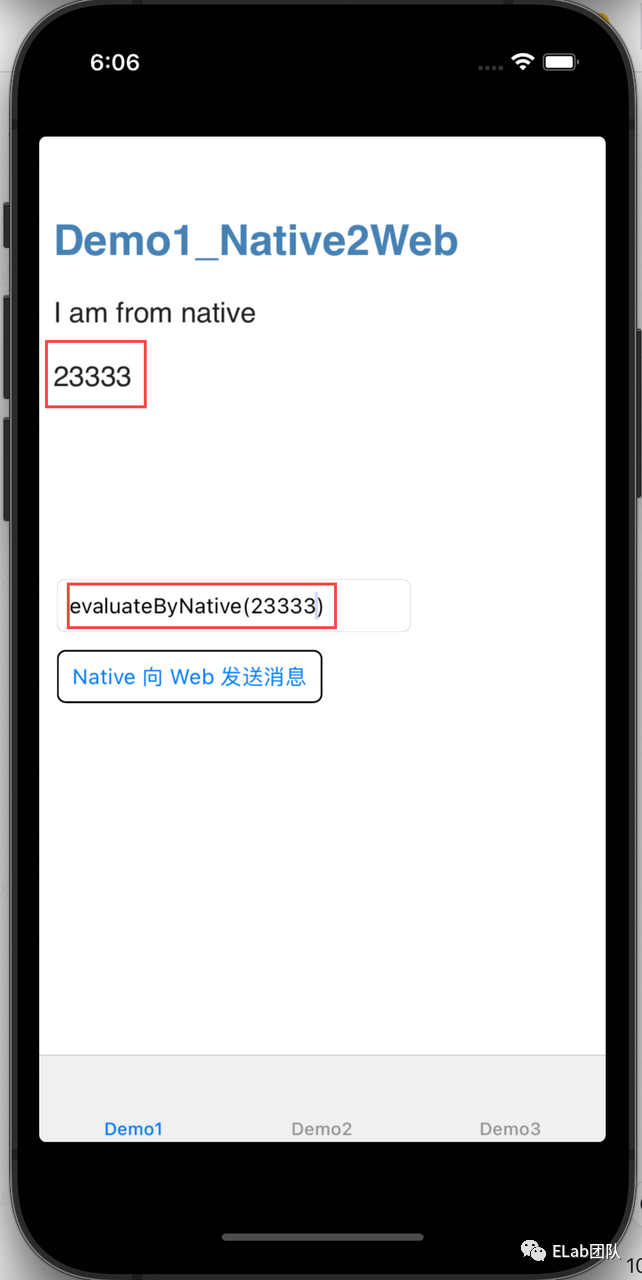 下面我们通过一个小 Demo 来看一下在 iOS 端实现 Native 向 Web 端发消息的实际效果: