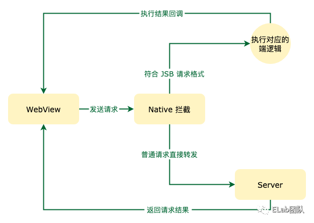 和浏览器类似 WebView 中发出的所有请求都是可以被 Native 容器感知到的(是不是想到了Gecko),因此拦截式具体指的是 Native 拦截 Web 发出的 URL 请求,双方在此之前约定一个 JSB 请求格式,如果该请求是 JSB 则进行相应的处理,若不是则直接转发。