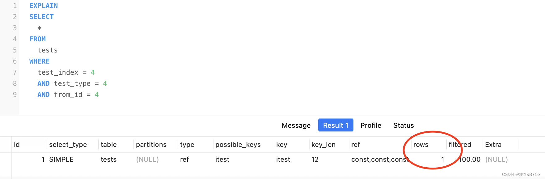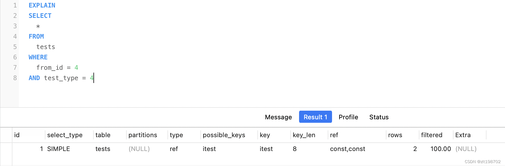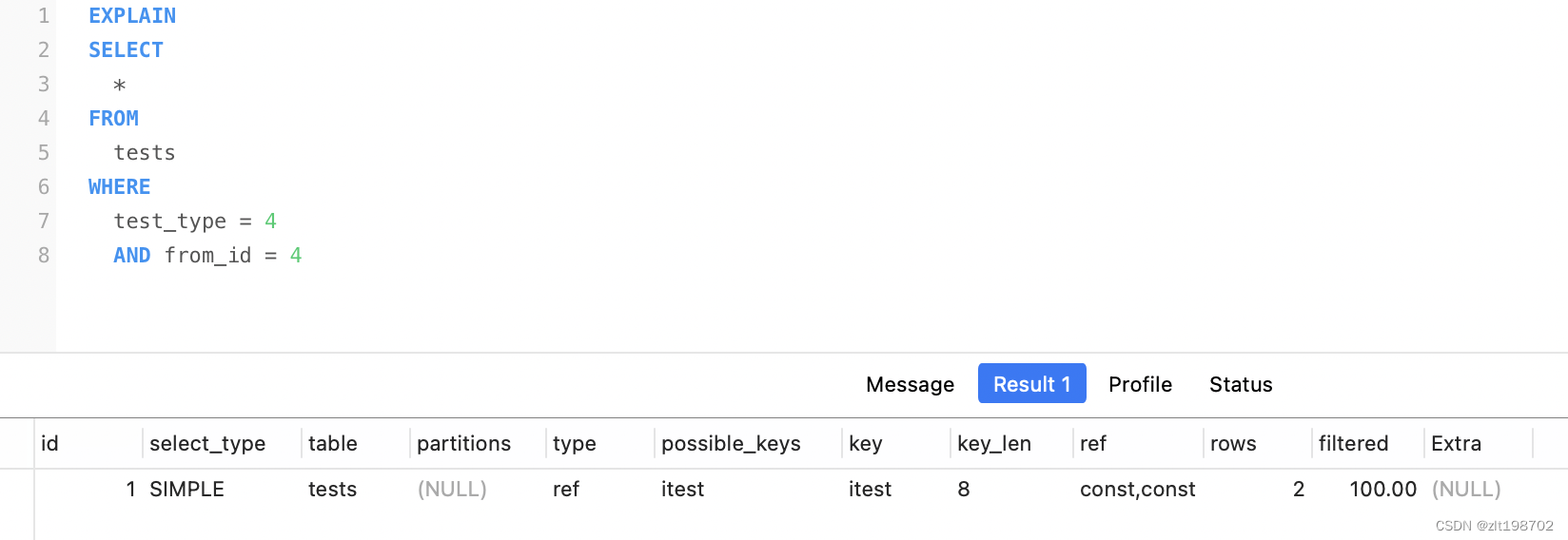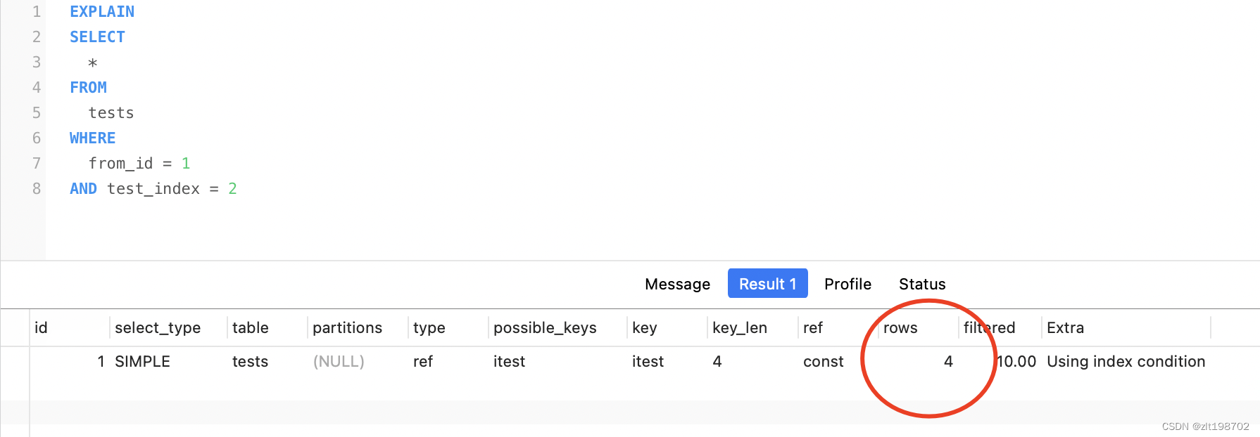数据库中,from_id的索引为a,这个时候看到,索引仅仅命中了i(a),但是没有命中c。所以i(a,c)的查询,并非没有走索引,而是仅仅命中i(a)。