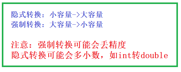 | int—>double | 变量*0.1 | double sum= number1 * 0.1 / number2; |