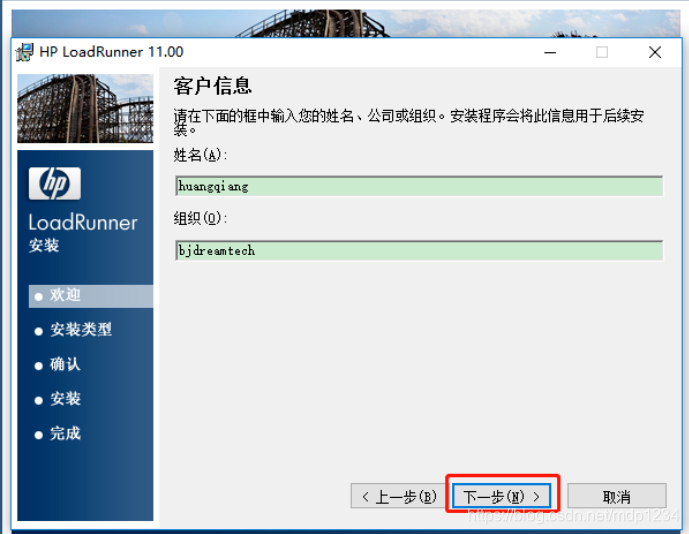 6、填写姓名和组织,随便填写就行了,然后下一步