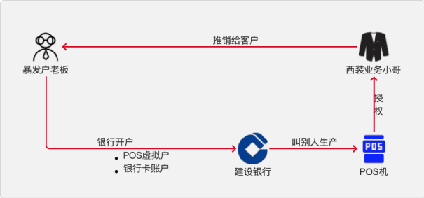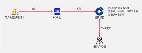 POS收单,因为我暴发户老板开户行是建设银行,POS机也是建设银行。这个建设银行就是收单行,所以需要考虑到两种场景: