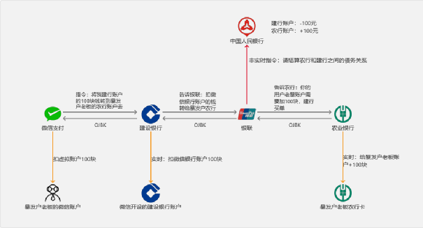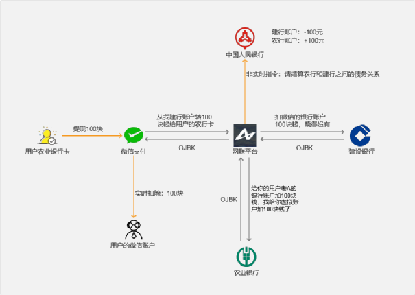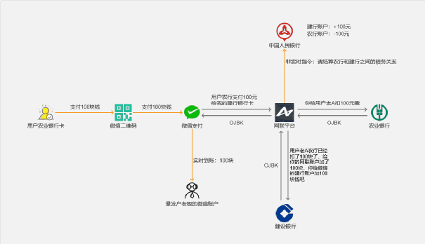 农行说,OJBK。于是扣了用户老A的100块钱。然后问下建行,这100块钱,怎么给你啊?