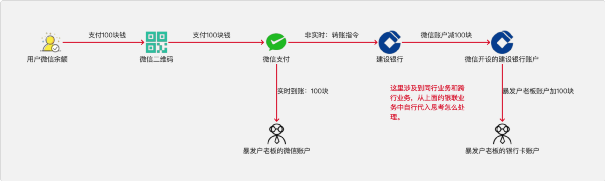 我们先看下提现环节的同行提现流程,就是从微信的建行账户转到用户或者暴发户老板的建行账户时的流程: