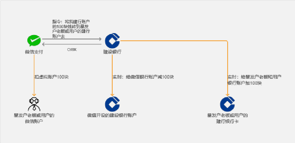 2、微信告诉网联,从我的建行账户转100块给用户农行卡;