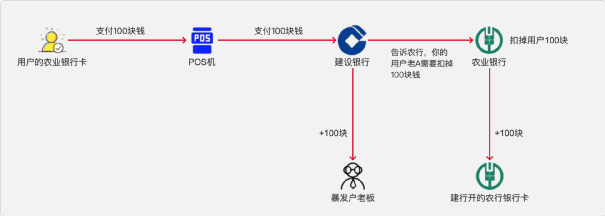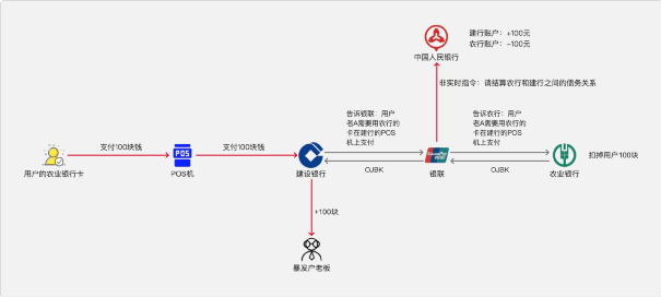 用户掏出农业银行卡,需要在建行的POS机上面刷100块。建行无权直接从用户的农行账户中扣除100块,所以需要找合作的农行交流下:你帮我扣一下你的用户老A的100块钱吧,到时候你再还给我(记账)。