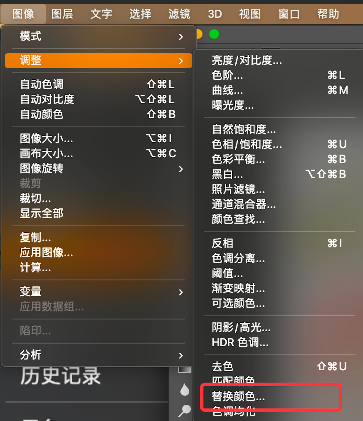 - 点击菜单栏的【图像】-【调整】-【替换颜色】