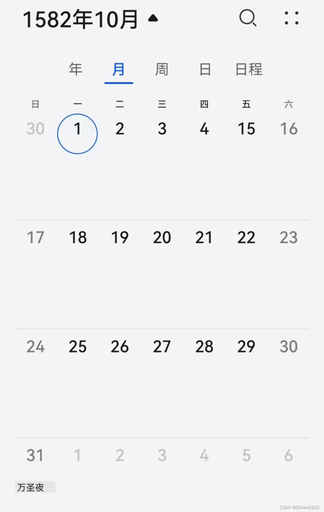 之后,我突然想起之前看过的一篇文章,介绍说历史上有一段日期是没有记载的,查了一下,果然发现手机日历上1582年10月4日之后紧跟的是15日而不是5日,这一年10月5日到14日没有在日历上出现: