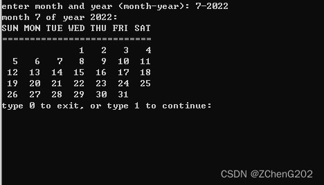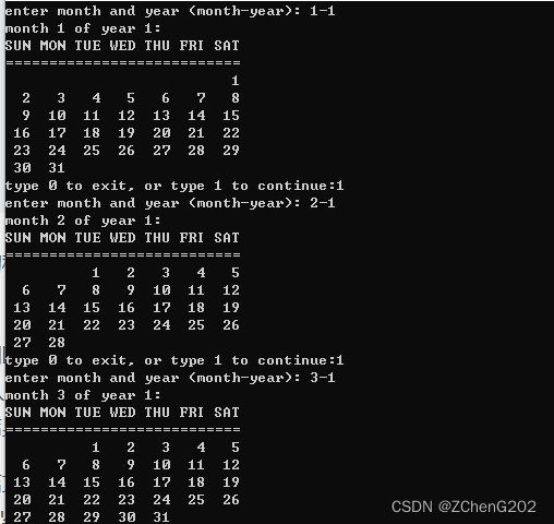 /*** @file demo.c* @author ZchenG202 (zhuchenguang202@mails.ucas.ac.cn)* @brief This program print calendar for a given month after January of AC 1.* The program considered the change of calendar in October of 1582.* @version 2.0* @date 2022-07-22* * @copyright Copyright (c) 2022* */#include <stdio.h>/*** @brief return the number of days of a year* * @param y * @return int */
