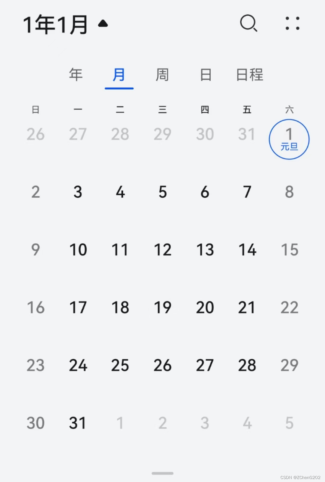 前些天在CSDN每日一练上做到了万年历程序的一道题,觉得很有意思,于是便尝试自己写写看,结果遇到了“公元1年1月1日是星期几”这个问题。拿着手机翻华为日历翻了半天,找到了这一天是星期六: