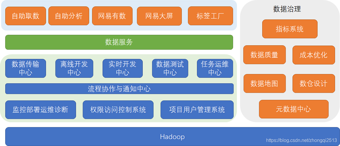 大数据平台按照使用场景,分为数据集成、数据开发、数据测试……任务运维,大数据平台的使用对象是数据开发。大数据平台的底层是以 Hadoop 为代表的基础设施,分为计算、资源调度和存储等。
