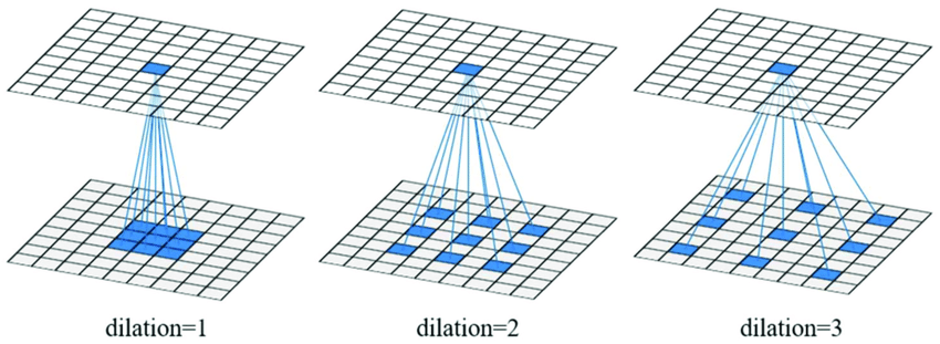 这样每次进行单次计算时覆盖的面积(感受域)增大,最开始时3*3 = 9 然后是5*5 = 25最后是7*7=49,增加了感受域却并未增加计算量,保留了更多的细节信息,对图像还原有明显的提升。