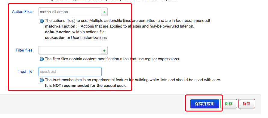 match-all.action。Filter files 和 Trust files 均留空。 - Access Control(访问控制):Listen addresses 填写