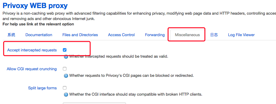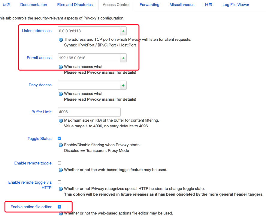 0.0.0.0:8118,Permit access 填写192.168.0.0/16。Enable action file editor 勾选。 - Miscellaneous(杂项):Accept intercepted requests 勾选。