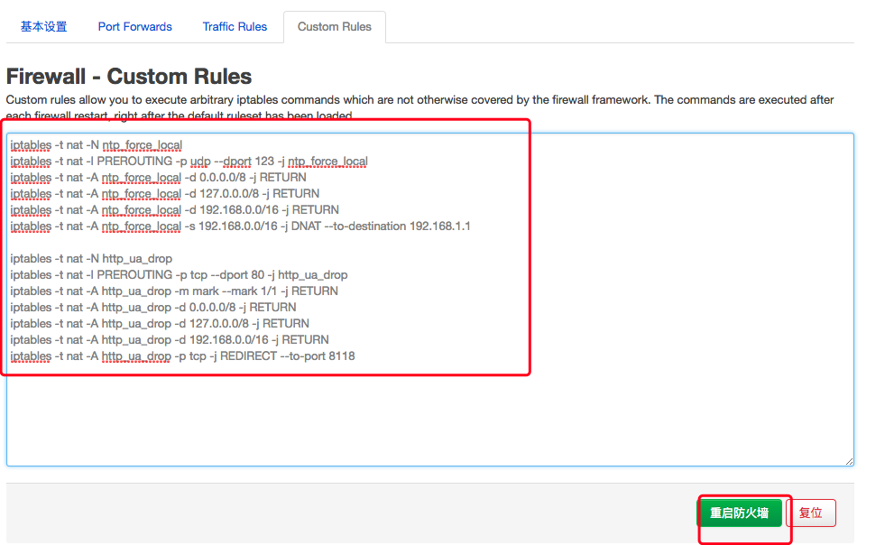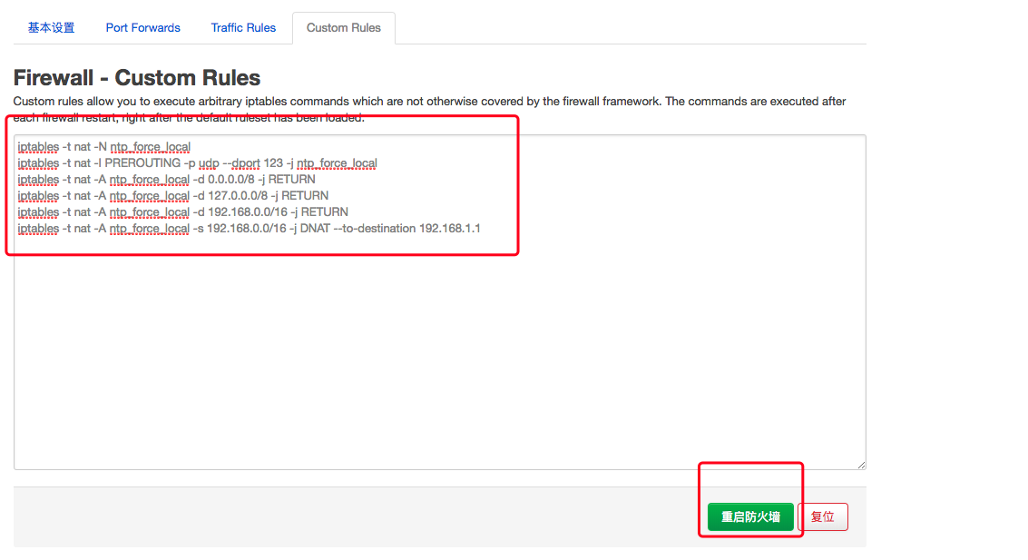 192.168.1.1需要修改为你的路由器的管理页面地址。例如,你的管理页面地址是192.168.10.1,那么这一行代码需要修改为:iptables -t nat -A ntp_force_local -s 192.168.0.0/16 -j DNAT --to-destination 192.168.10.1然后点击 Restart Firewall(重启防火墙)。