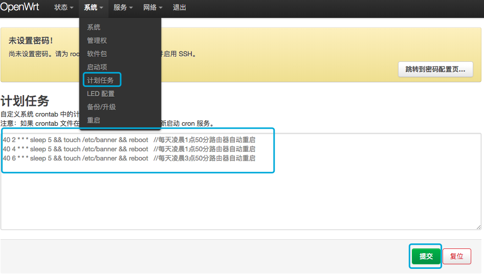 40 2 * * * sleep 5 && touch /etc/banner && reboot //每天凌晨2点40分路由器自动重启