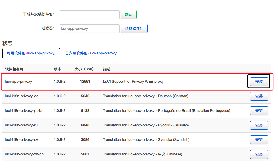 luci-app-privoxy,点击 Find package(查找软件包)按钮。点击下方“luci-app-privoxy”对应的 Install(安装)按钮。如果提示好几条“Configuring xxxx”,那么就是执行成功了;如果卡死后再进入管理页面,看到有一个 Services(服务)菜单,菜单里有 Privoxy WEB proxy(Privoxy 网络代理),那也是成功了。