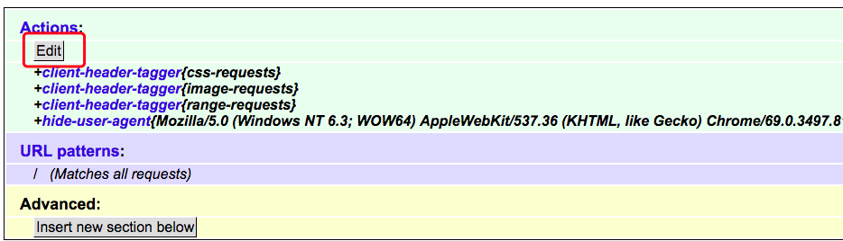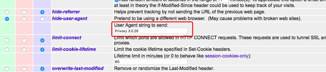 http://config.privoxy.org/edit-actions-list?f=0,如果打不开,请重启路由器多测试几遍。点击 Edit 按钮。在Action 那一列中,hide-user-agent 改选为 Enable(绿色),在右侧 User Agent string to send 框中填写以下内容:Privoxy 3.0.26