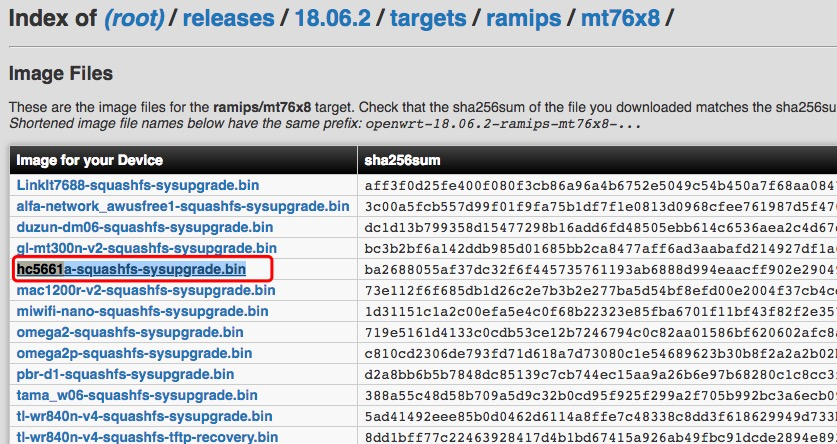 点击这里OpenWrt Downloads下载对应型号的OpenWrt固件,以极路由1S HC5661A为例,点击下载openwrt-18.06.2-ramips-mt76x8-hc5661a-squashfs-sysupgrade.bin