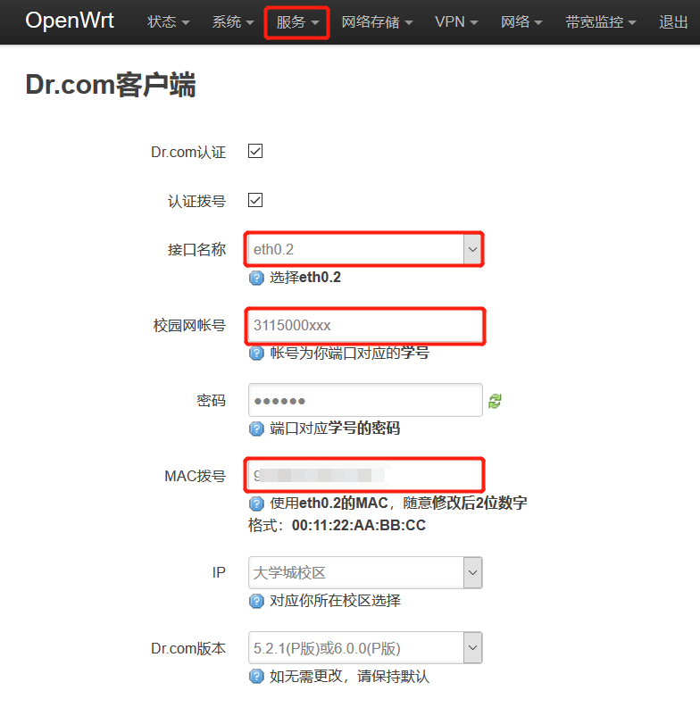 - PAP/CHAP password(PAP/CHAP 密码):校园网密码