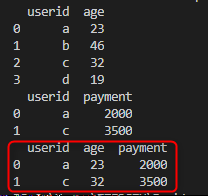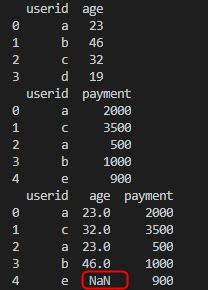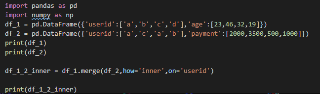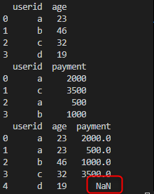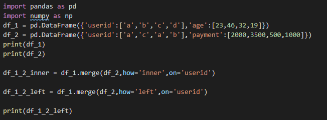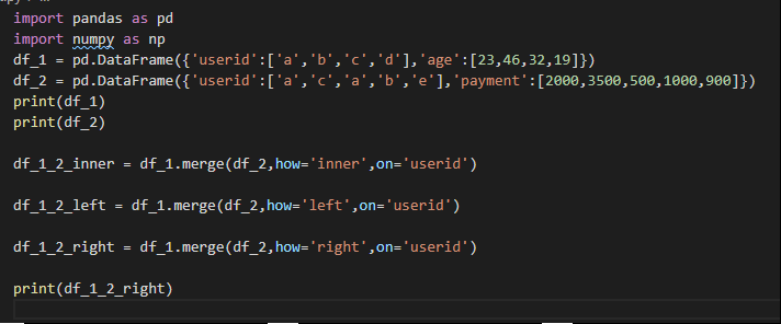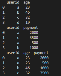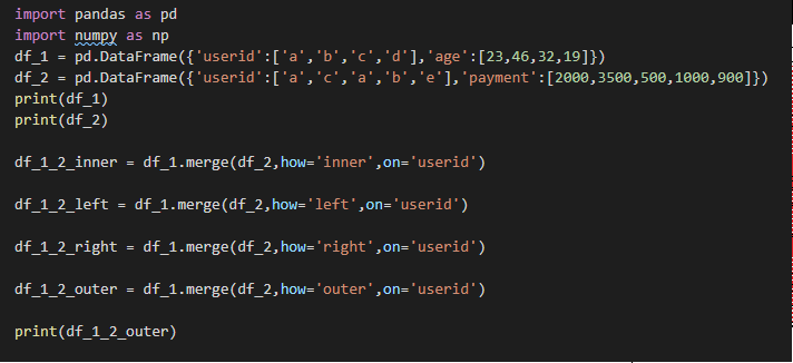 print(df_2)df_1_2_inner = df_1.merge(df_2,how='inner',on='userid')df_1_2_left = df_1.merge(df_2,how='left',on='userid')df_1_2_right = df_1.merge(df_2,how='right',on='userid')df_1_2_outer = df_1.merge(df_2,how='outer',on='userid')print(df_1_2_outer)