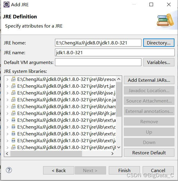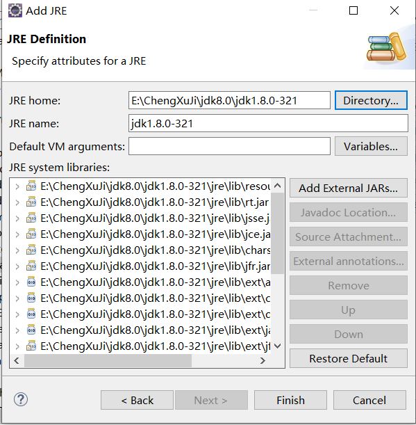 5.添加安装目录;安装jdk的时候有2个目录,一个是jdk,一个是jre,这边选择jre目录;点击“finish”;