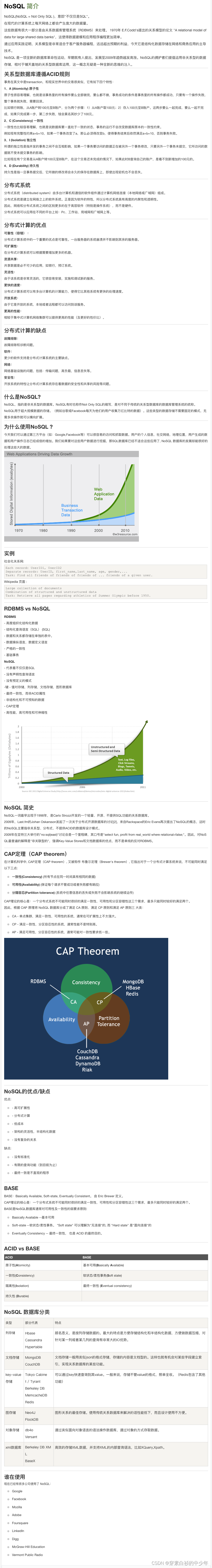 2.整理输出历史演进2.1 介绍非关系型数据库, NoSQL主要分为四类,如下所示,以及各自的特点,应用场景,有缺点 补充 什么是 NoSQL_AWS NoSQL高性能非关系数据库服务-AWS云服务 -- 推荐阅读 推荐阅读