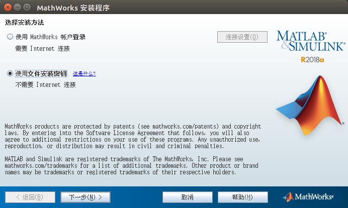 1)将Matlab2018aLinux64Crack.tar.gz解压出来的 license_standalone.lic 复制到 /usr/local/MATLAB/R2018a/licenses/